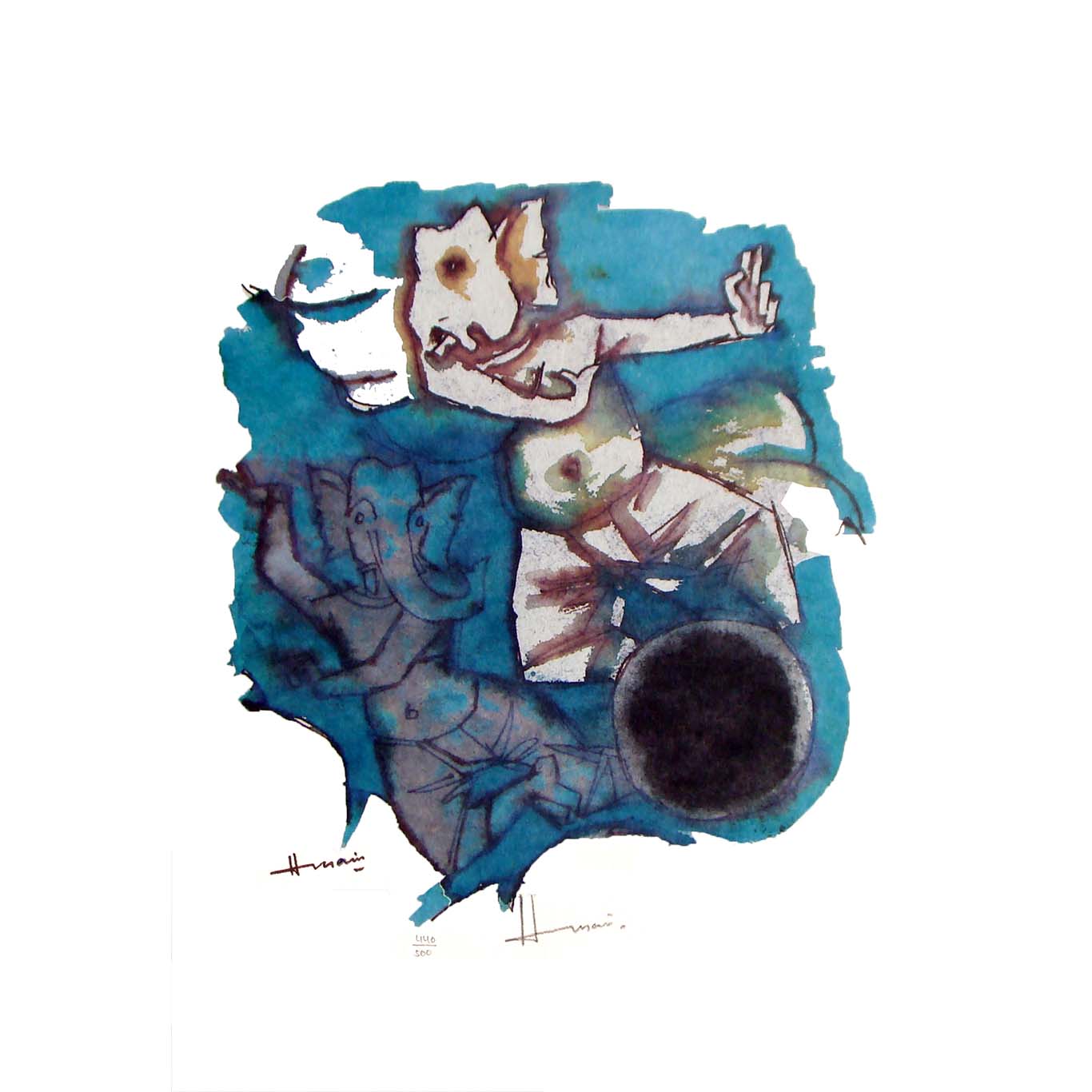 The final work closes the cycle in serene simplicity. Ganesha sits poised, drawn in bold lines softened by Husain’s washes. Beside him shines a round moon of renewal, marking rhythm and the eternal cycle.