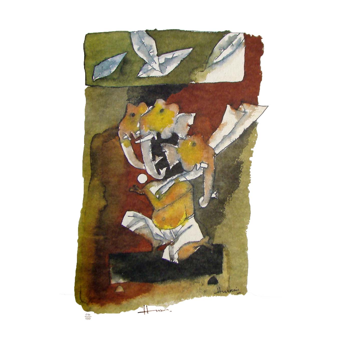 Husain’s lines are loose, alive with diagonals guiding energy across the figure. Red-brown earth tones anchor the ground, while yellow accents brighten the god with vitality. The white boats glow softly, their edges blurred by watercolour bleeds, like folded paper dampened by imagination.