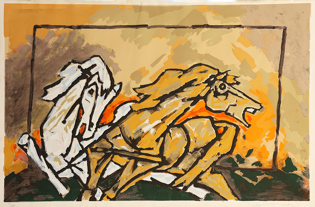 In this work, MF Husain captures the raw surge of energy through two horses in motion. Their forms, outlined in bold strokes, lean forward as if charging beyond the frame itself. Every bold stroke propels the viewer into their gallop and conveys the very essence of force and speed.