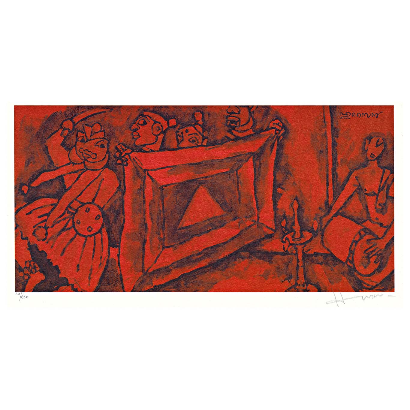 This serigraph is a bridge: a local theatre made visible to global eyes. The painting is both Kerala’s pulse and Husain’s cinema, a reminder that storytelling in India wears many costumes.