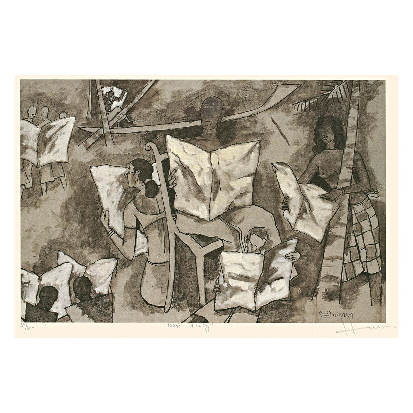 In this serigraph, Husain transforms the simple act of reading into a collective ritual of empowerment. Figures bend over newspapers, their bodies welded by bold lines into a chorus of curiosity. Kerala is known for its high literacy, and Husain honours it as both local truth and universal image. The work becomes a lamp of knowledge, carried not by one but by many.