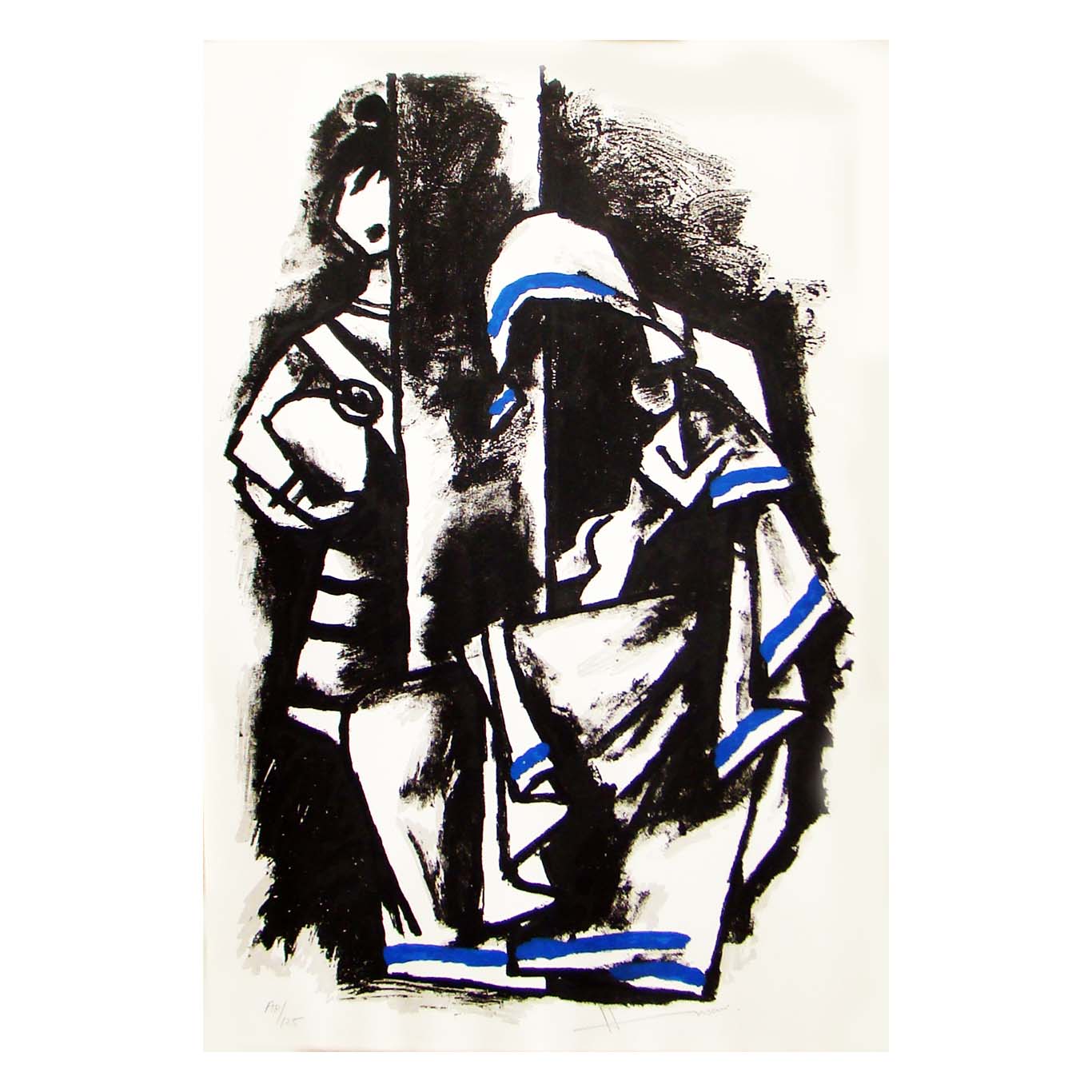 In this serigraph, MF Husain immortalises Mother Teresa as the Eternal Mother, a presence of compassion that moves beyond time and place. Her iconic white sari with blue borders defines her figure in strong black lines, her posture bent in care and humility. The black and white palette, punctuated only by the blue accents, amplifies both austerity and grace.