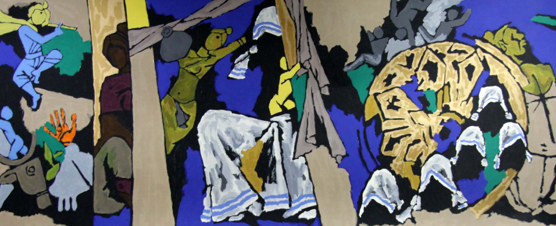The work is a symphony of symbols and devotion. Mother Teresa appears in her iconic white sari with blue lines, multiplied into rhythmic forms that echo her mission of service through countless sisters of charity. The golden circular form behind them becomes both halo and wheel, suggesting the eternal cycle of compassion and sacrifice. The repetition of figures in white speaks of humility, discipline, and faith turned into daily action.